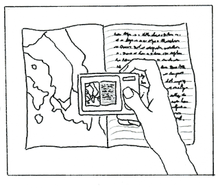 Hand-drawn graphic representing photographing a page in a Field Papers atlas